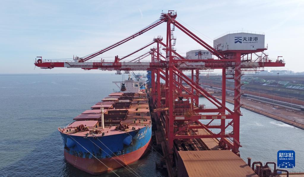 在天津港南疆港區26泊位,卸船機在進(jìn)行卸貨作業(yè)(1月28日攝,無(wú)人機照片)。新華社記者 趙子碩 攝