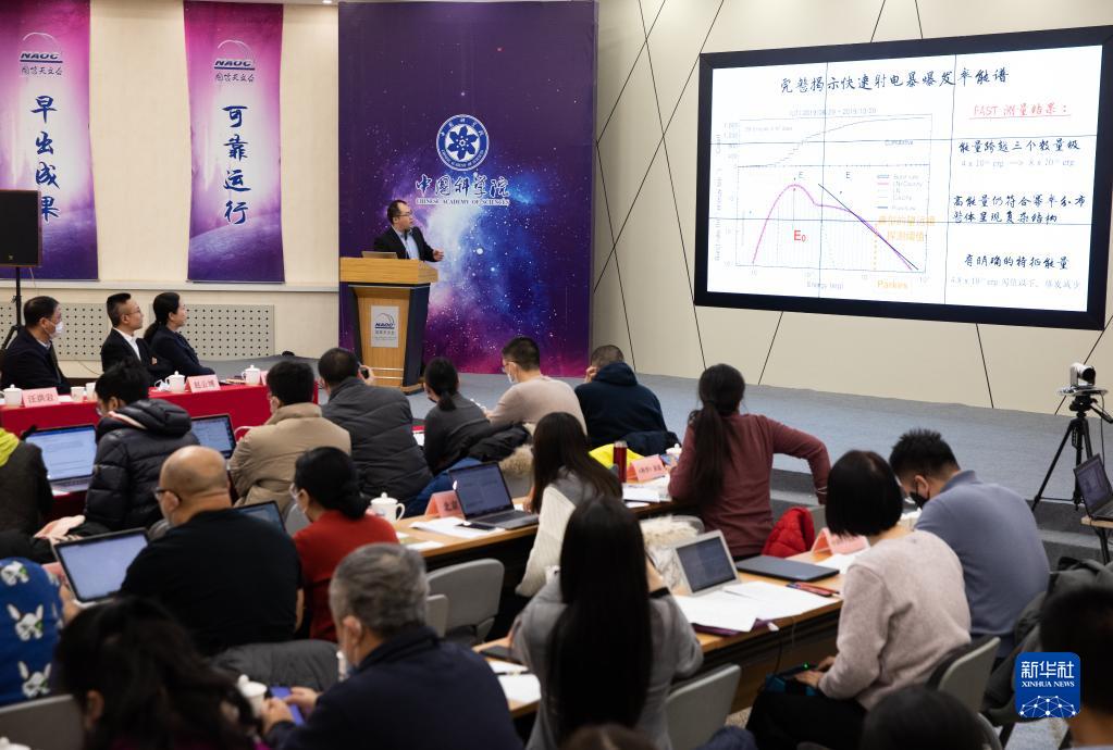 1月5日,在中科院國家天文臺舉行的新聞發(fā)布會(huì )上,國家天文臺王培在介紹FAST在快速射電暴領(lǐng)域的重大成果。新華社記者 金立旺 攝