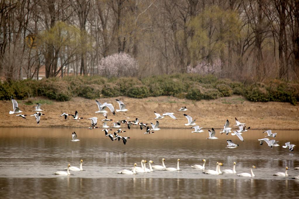 ↑圖為在北京沙河拍攝到的天鵝等鳥(niǎo)類(lèi)棲息飛翔圖景(何建勇攝)
