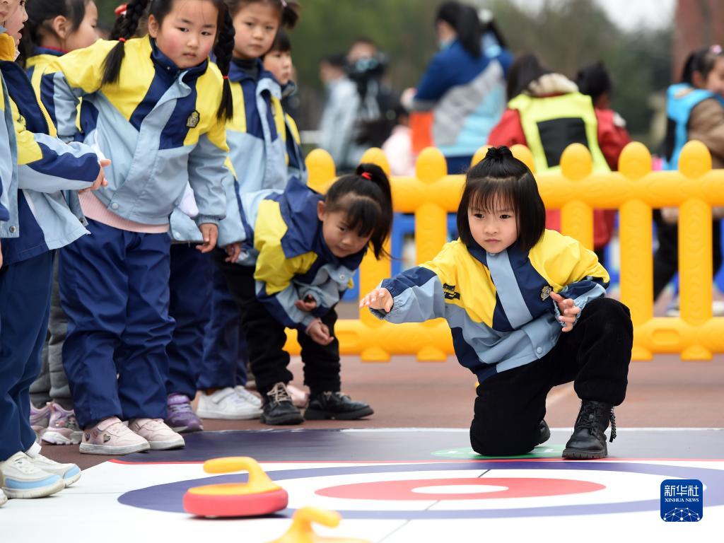 2月16日,安徽省合肥市泰山路幼兒園的小朋友在開(kāi)學(xué)典禮上體驗“旱地冰壺”游戲。新華社記者 周牧 攝