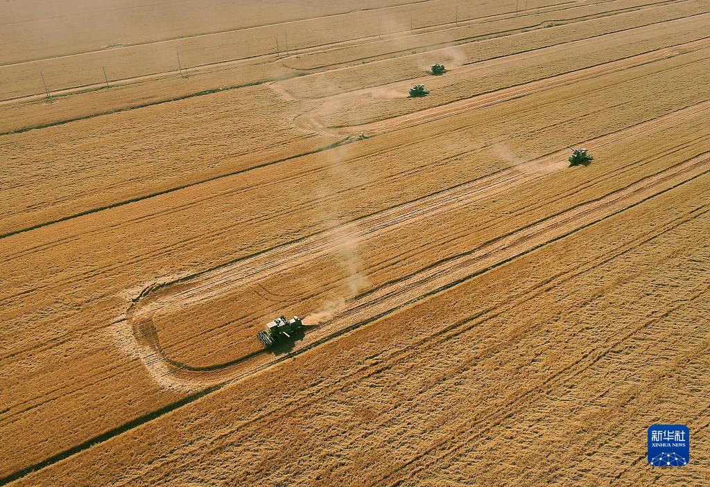 在河南省黃泛區農場(chǎng)九分場(chǎng)的麥田里,農機手操作收割機收獲小麥(2021年6月6日攝,無(wú)人機照片)。新華社記者 李安 攝