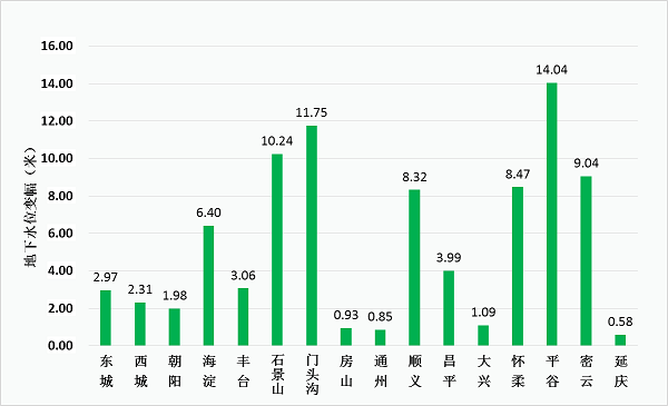 這是今年3月中旬與2021年同期對比,北京市各區地下水水位變幅柱狀圖。(北京市水務(wù)局供圖)