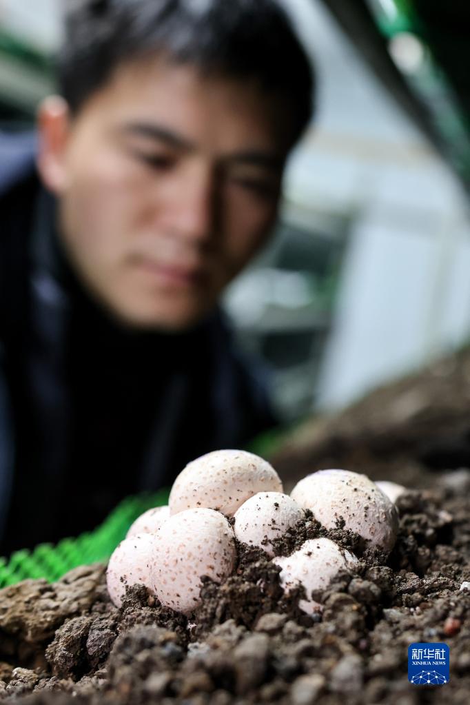 工作人員在貴陽(yáng)市白云區食用菌產(chǎn)業(yè)示范園智能菇房?jì)炔榭淳缴L(cháng)情況(2月14日攝)。新華社記者 歐東衢 攝