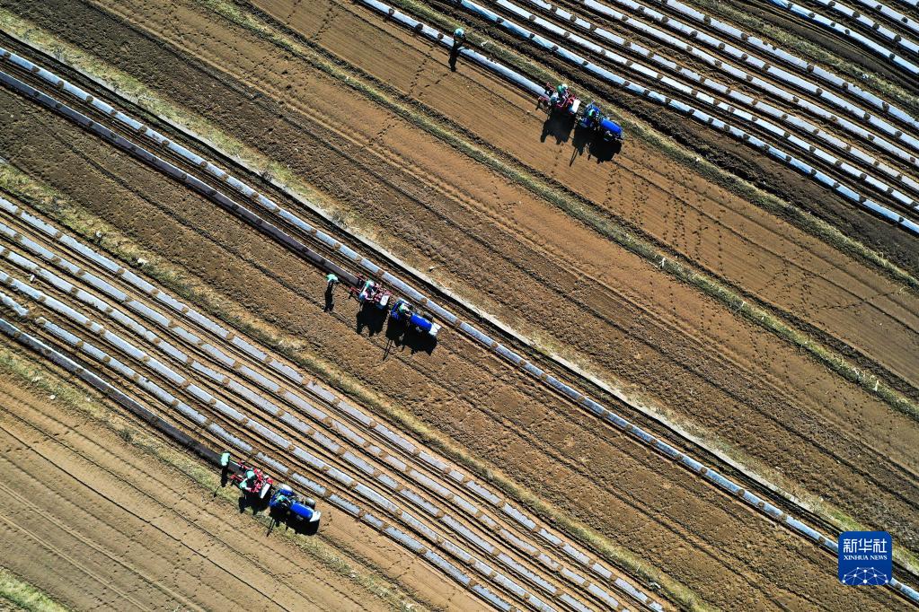 在貴州省威寧縣雙龍鎮涼山社區的眾果農機社會(huì )化服務(wù)基地,農民駕駛馬鈴薯自動(dòng)播種機在播種(3月8日攝,無(wú)人機照片)。新華社記者 楊文斌 攝