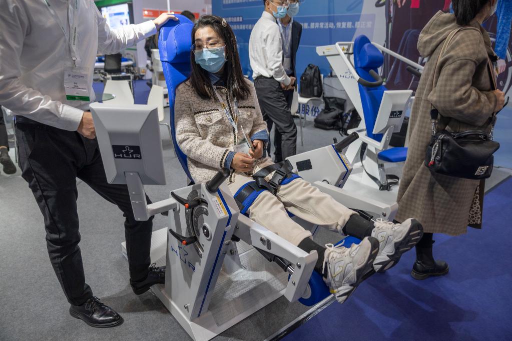 2021年10月16日,觀(guān)眾在中國國際福祉博覽會(huì )上體驗一款智能物聯(lián)網(wǎng)長(cháng)者運動(dòng)康復系統。新華社記者 才揚 攝