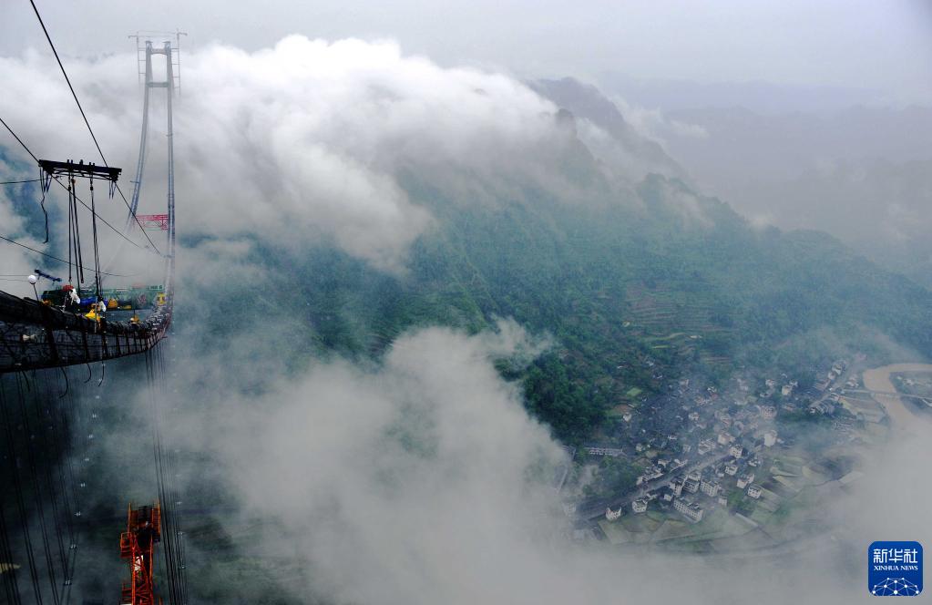 站在矮寨大橋一側的山嶺上遠眺,這座主跨1176米、沒(méi)有橋墩的大橋如同“懸掛”在峽谷上方300多米的高空中,往來(lái)車(chē)輛川流不息。