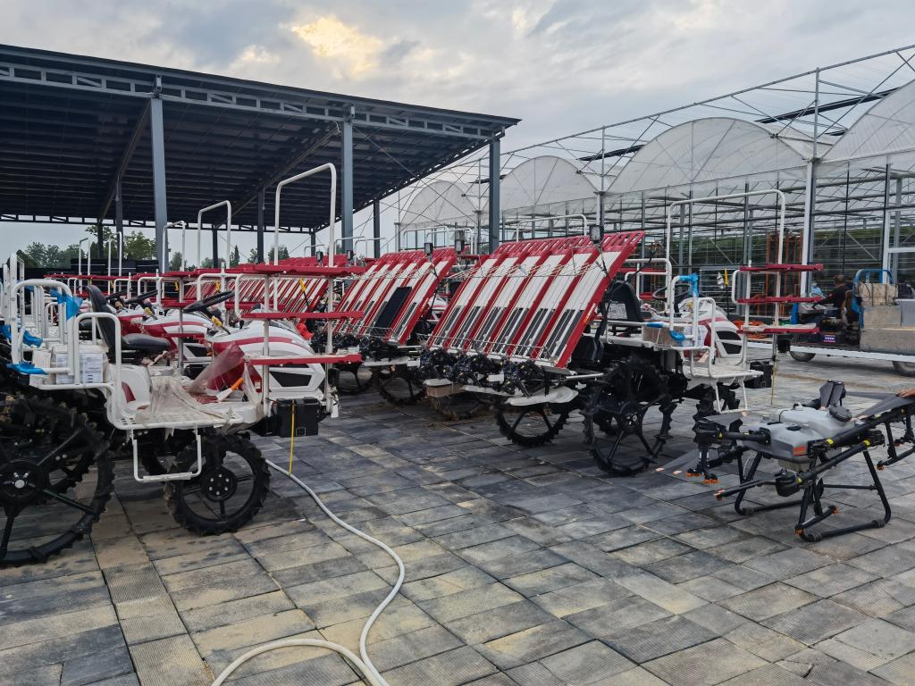 育秧中心棚前停放著(zhù)的插秧機。(新華社記者張健 攝)