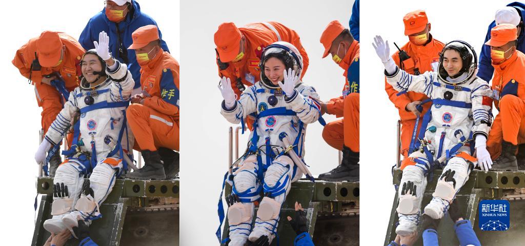4月16日,神舟十三號載人飛船返回艙在東風(fēng)著(zhù)陸場(chǎng)成功著(zhù)陸。這是航天員翟志剛、王亞平、葉光富(左至右)安全順利出艙(拼版照片)。新華社發(fā)