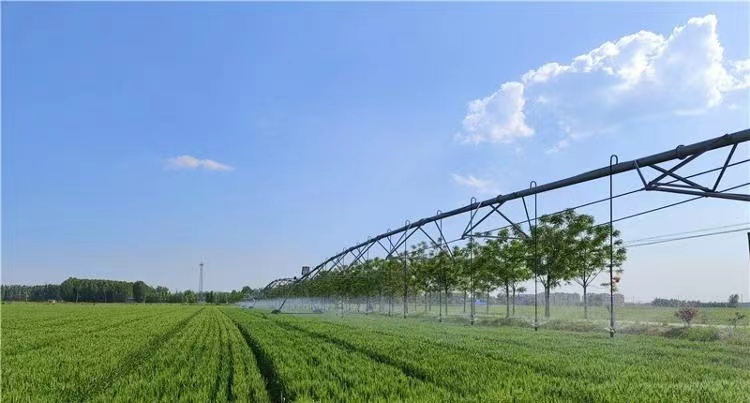 圖為泰安肥城市地龍農業(yè)機械專(zhuān)業(yè)合作社的移動(dòng)式噴灌機在“減壟”麥田上作業(yè)。(受訪(fǎng)者供圖)