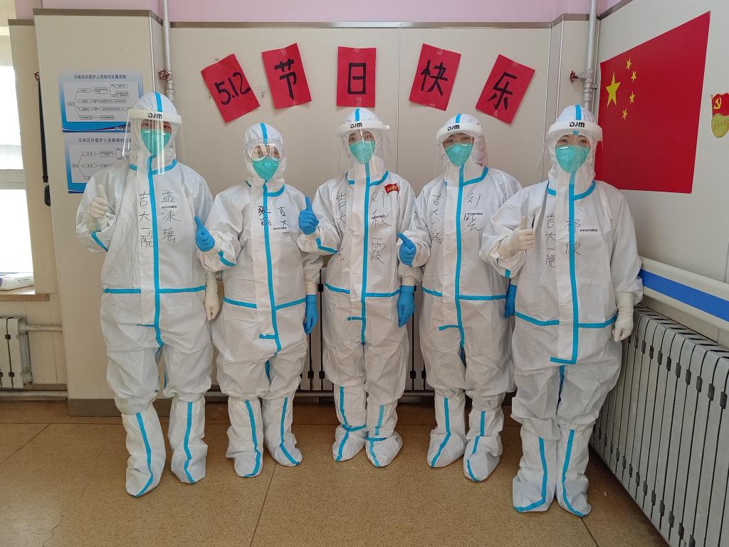 吉林大學(xué)第一醫院卒中中心副護士長(cháng)鄧秋霞(左三)和醫護人員在長(cháng)春市傳染病醫院支援。(受訪(fǎng)者供圖)
