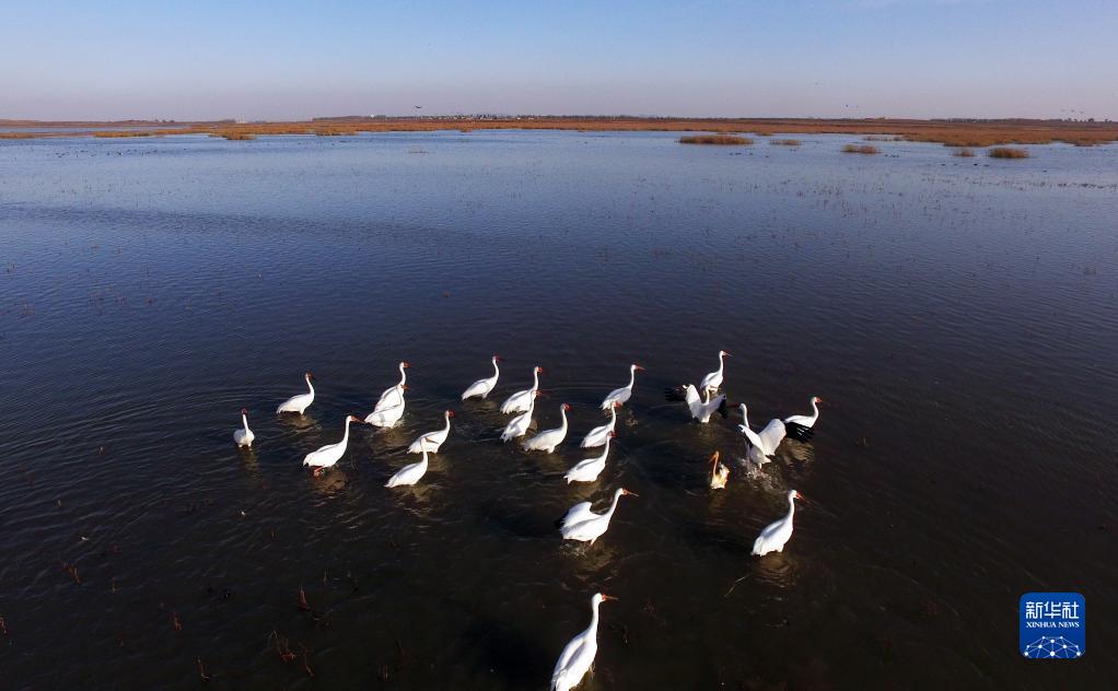 這是在遼寧省法庫縣獾子洞濕地拍攝的白鶴(2018年10月24日攝,無(wú)人機照片)。新華社記者 楊青 攝
