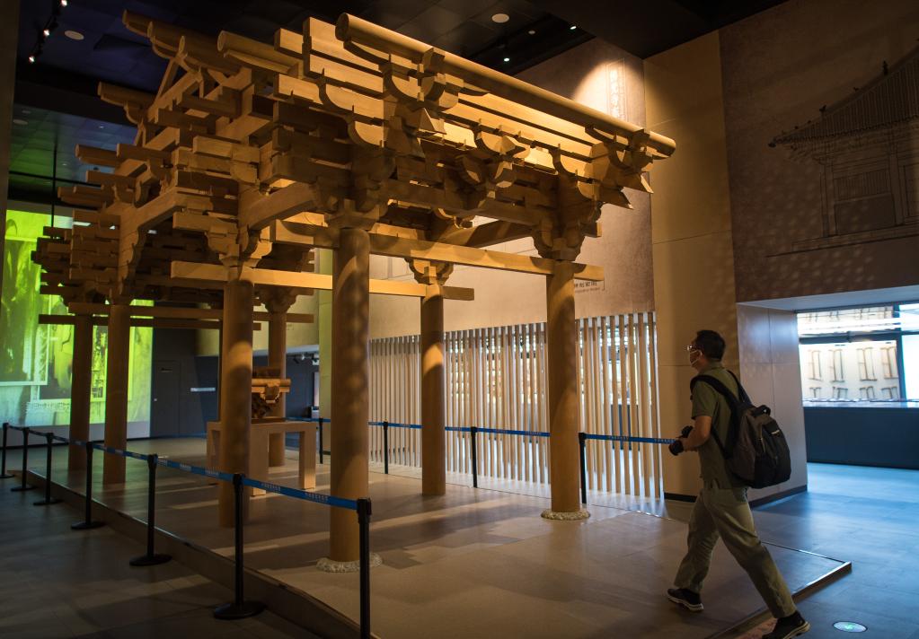 2020年8月19日,參觀(guān)者在中國建筑科技館內參觀(guān)佛光寺東大殿梁架結構的模型。新華社記者肖藝九攝