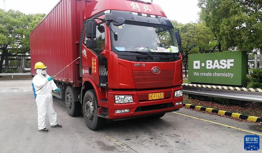 工作人員在位于上海市金山區的巴斯夫護理化學(xué)品(上海)有限公司工廠(chǎng)對貨車(chē)進(jìn)行消殺(4月15日攝)。新華社記者 丁汀 攝