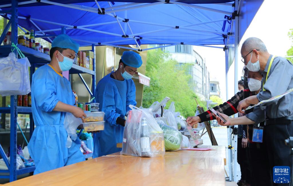 5月17日,市民在上海市嘉定區一家飯店的外賣(mài)攤位前掃碼購物。新華社記者 方喆 攝