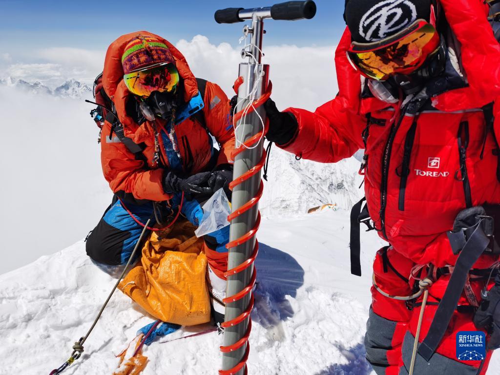 5月4日,德慶歐珠帶領(lǐng)的登頂小組科考隊員,在珠峰海拔8830米處架設世界海拔最高自動(dòng)氣象站,建成珠峰梯度氣象觀(guān)測體系;在峰頂首次利用高精度雷達測量冰雪厚度,并采集了峰頂冰雪樣品。