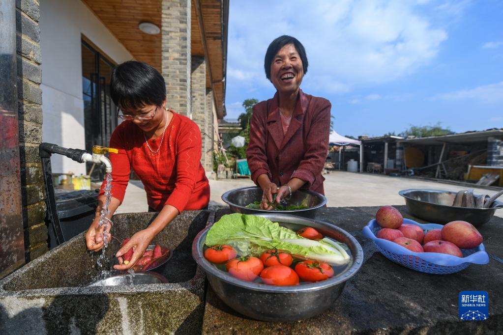 浙江省杭州市臨安區天目山鎮九獅村村民在家門(mén)口洗菜(2020年10月10日攝)。新華社記者 徐昱 攝