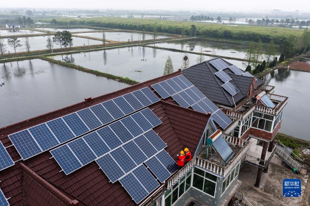 在浙江省湖州市德清縣乾元鎮齊星村,工作人員為當地村民的太陽(yáng)能屋頂光伏電站巡檢(無(wú)人機照片,2022年3月31日攝)。新華社記者 徐昱 攝