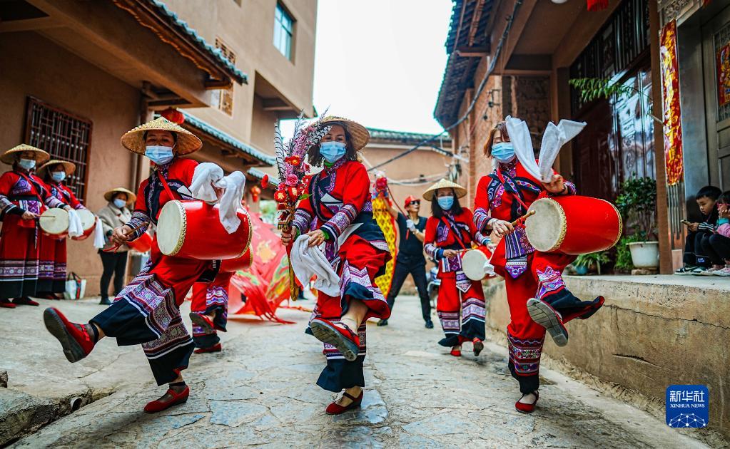 云南省昆明市晉寧區福安村村民在村里一年一度的民俗活動(dòng)上表演舞蹈(2022年4月5日攝)。新華社記者 江文耀 攝