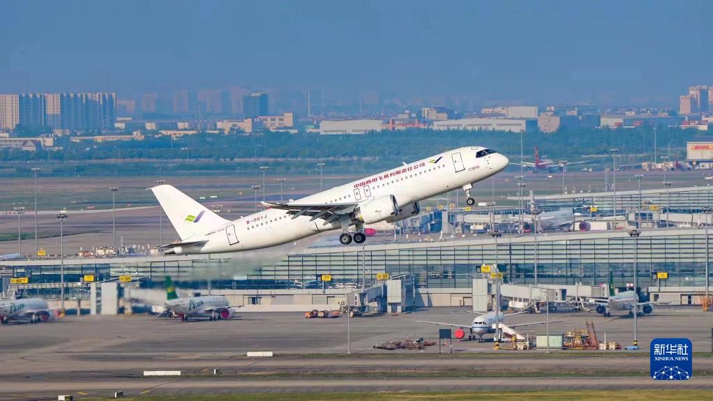 5月14日6時(shí)52分,編號為B-001J的C919大飛機從上海浦東機場(chǎng)第4跑道起飛,于9時(shí)54分安全降落,標志著(zhù)中國商飛公司即將交付首家用戶(hù)的首架C919大飛機首次飛行試驗圓滿(mǎn)完成。新華社發(fā)