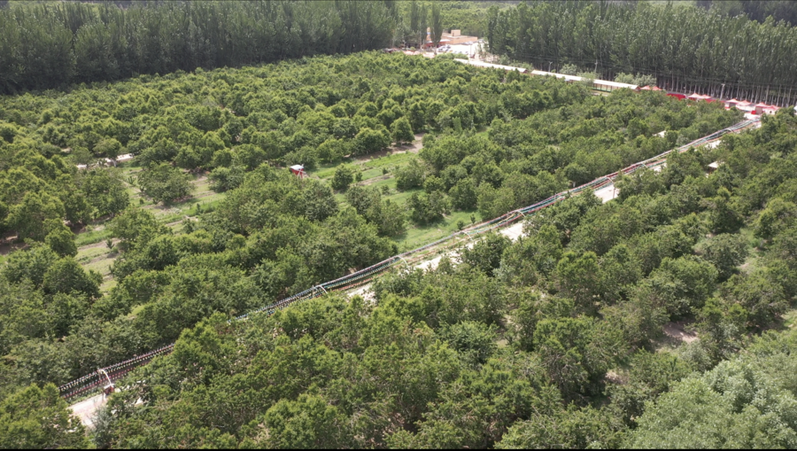 莎車(chē)縣米夏鎮夏瑪勒巴格村櫻桃農民專(zhuān)業(yè)合作社的櫻桃園。(麥麥提艾力·麥麥提明 攝)(無(wú)人機照片)