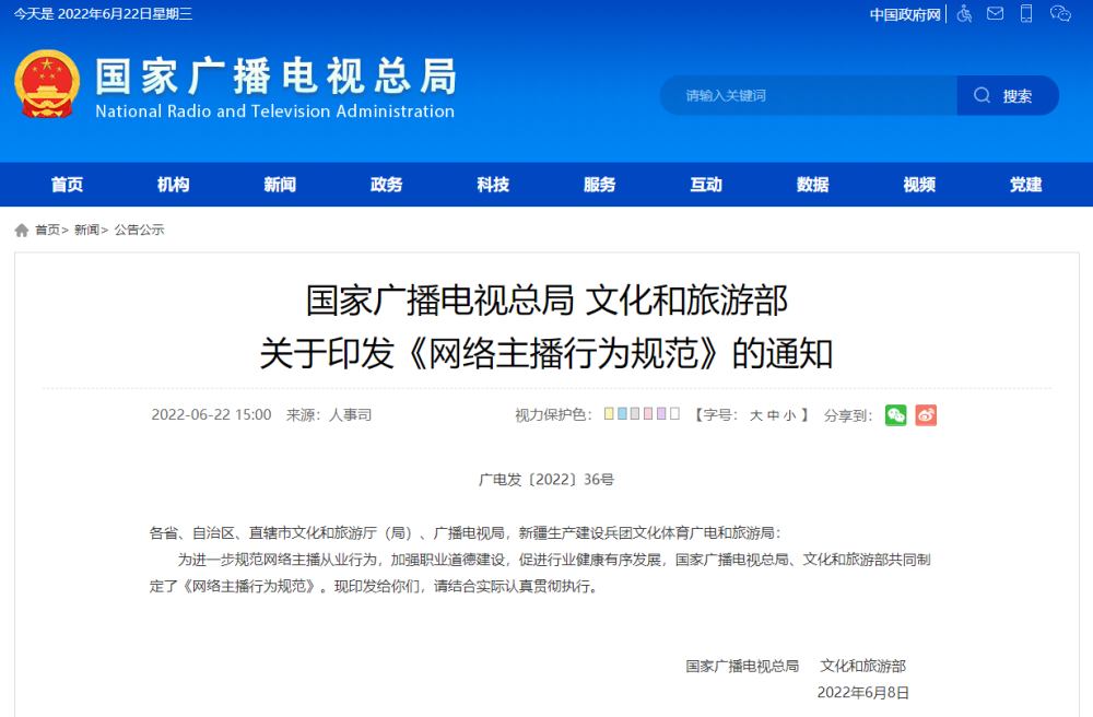 為進(jìn)一步規范網(wǎng)絡(luò )主播從業(yè)行為,加強職業(yè)道德建設,促進(jìn)行業(yè)健康有序發(fā)展,國家廣播電視總局、文化和旅游部共同制定了《網(wǎng)絡(luò )主播行為規范》?,F印發(fā)給你們,請結合實(shí)際認真貫徹執行。