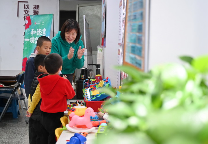 2021年12月4日,張潔(右一)在“村童媽媽聚樂(lè )部”教小朋友演唱歌曲《愛(ài)的鼓勵》。 新華社記者 林善傳 攝
