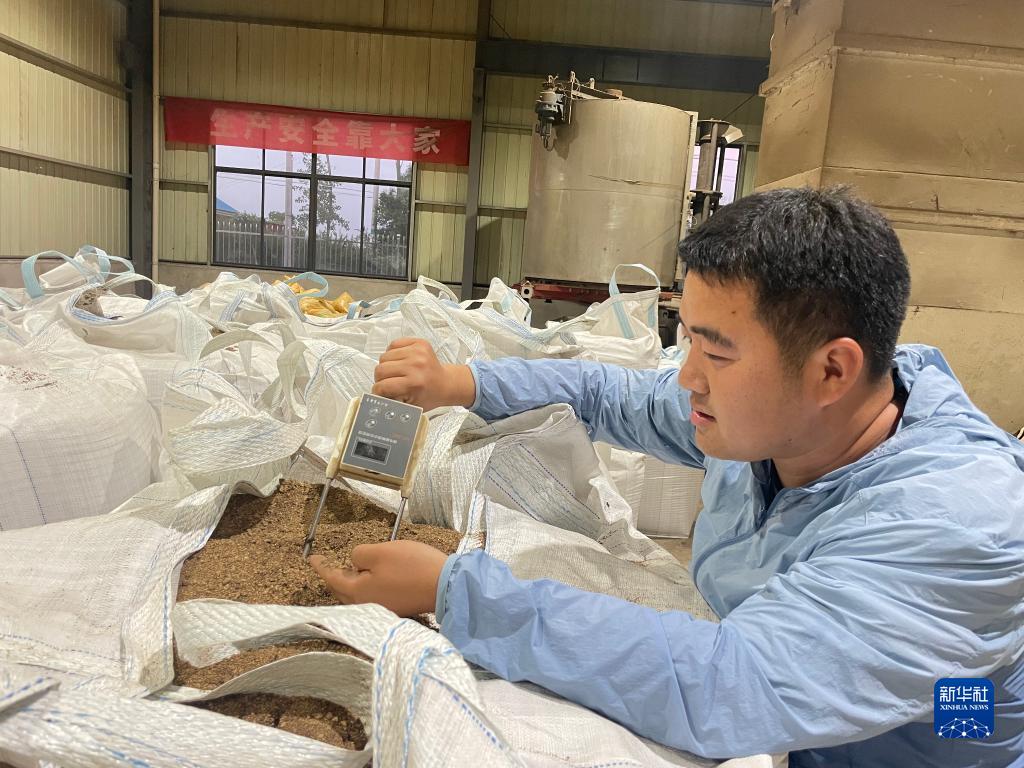 7月7日,安徽省滁州市天長(cháng)市種糧大戶(hù)平東林在秸稈炭化廠(chǎng)房用水分測定儀檢測秸稈炭粉水分指標。新華社發(fā)(朱禮明 攝)