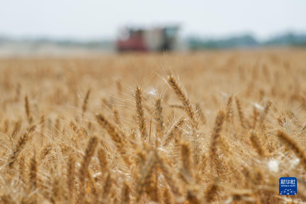在安徽省亳州市渦陽(yáng)縣店集鎮宋來(lái)寶農作物種植專(zhuān)業(yè)合作社,收割機在麥田中收割小麥(6月7日攝)。新華社記者 杜宇 攝