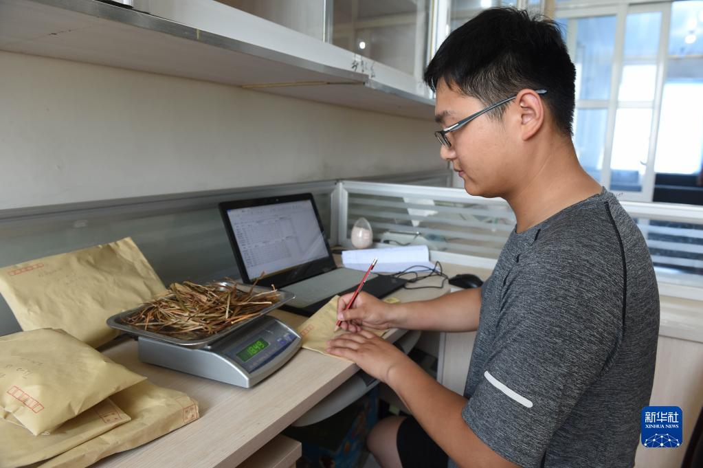 在安徽省阜陽(yáng)市太和縣舊縣鎮,徐旭東在實(shí)驗室對農作物樣品進(jìn)行稱(chēng)重和記錄(6月28日攝)。新華社記者 周牧 攝