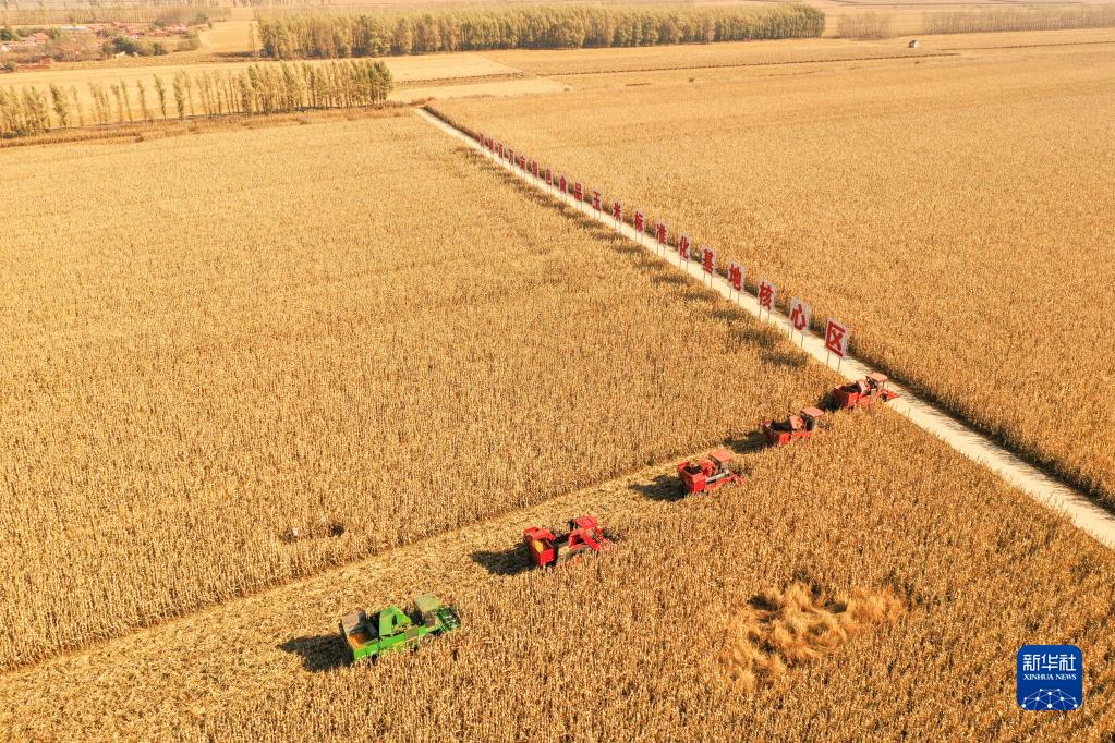 在吉林省梨樹(shù)縣國家百萬(wàn)畝綠色食品原料(玉米)標準化生產(chǎn)基地核心示范區,農民駕駛農機進(jìn)行秋收作業(yè)(無(wú)人機照片,2021年10月23日攝)。新華社記者 張楠 攝