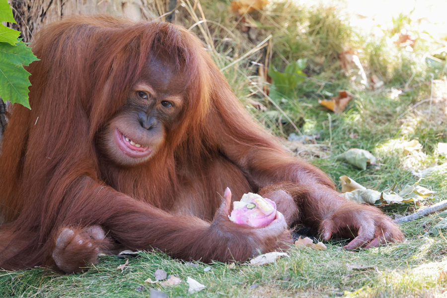 7月18日,在比利時(shí)布呂熱萊特市天堂動(dòng)物園,一只紅毛猩猩享用“冰淇淋”。