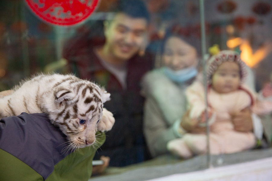1月26日,在浙江湖州長(cháng)興太湖龍之夢(mèng)動(dòng)物園,保育員抱著(zhù)白虎寶寶與游人見(jiàn)面。