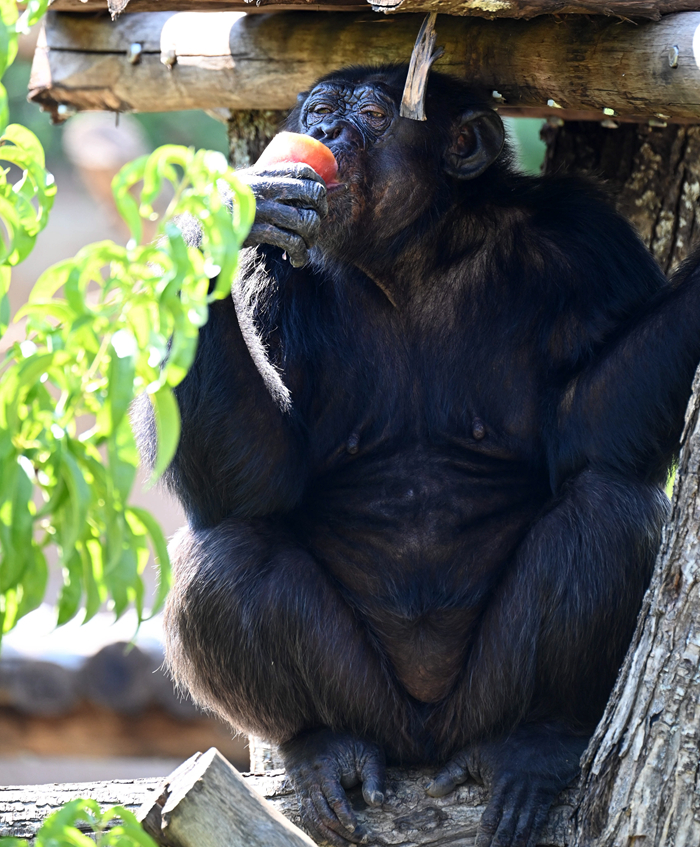 7月19日,在意大利羅馬動(dòng)物園,一只黑猩猩吃水果冰棍消暑。