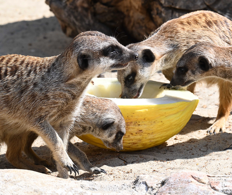 7月19日,在意大利羅馬動(dòng)物園,貓鼬吃冰鎮蜜瓜消暑。