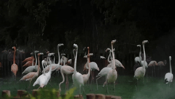 7月15日,上海野生動(dòng)物園的火烈鳥(niǎo)享受?chē)婌F降溫。