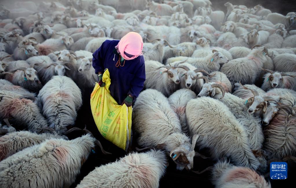 在青海省海北藏族自治州剛察縣沙柳河鎮新海村,牧民彭毛卓瑪在給自家羊群喂飼料(2017年11月29日攝)。新華社記者 張宏祥 攝