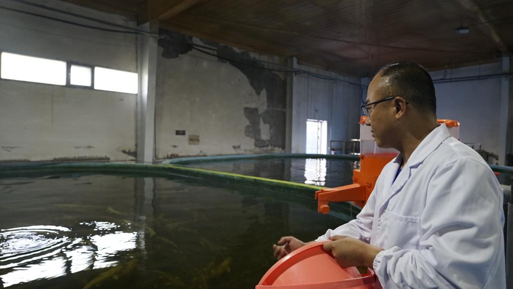 8月8日,青海湖裸鯉救護中心的工作人員為繁育車(chē)間里的湟魚(yú)喂食。新華社記者陳杰 攝