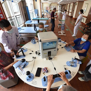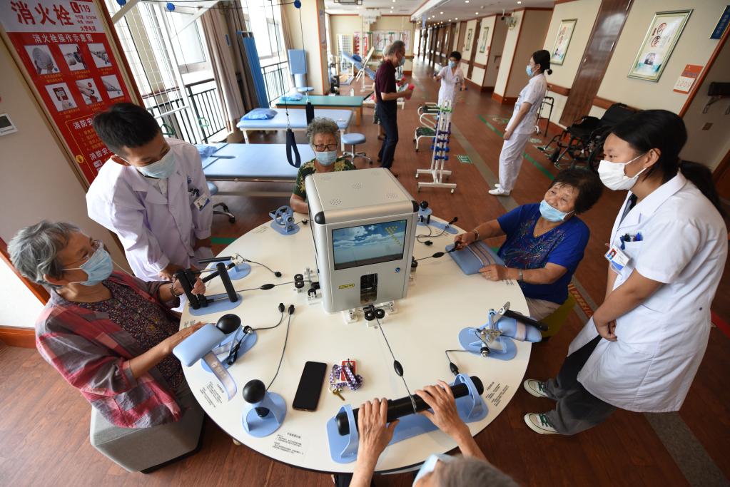 8月5日,在山東日照頤養公寓,醫生指導老人通過(guò)手功能綜合康復訓練平臺進(jìn)行手指鍛煉。新華社記者 范長(cháng)國 攝