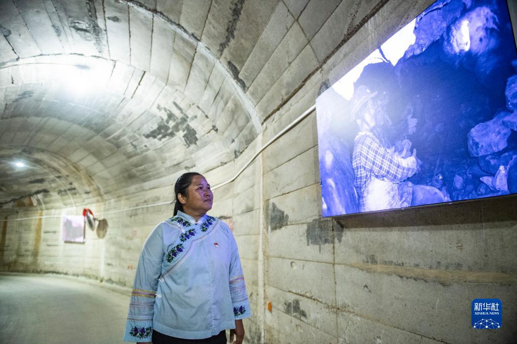 在貴州省羅甸縣沫陽(yáng)鎮麻懷村,鄧迎香在隧道內看著(zhù)過(guò)去的照片,回憶開(kāi)山挖洞的情景(2020年8月31日攝)。新華社記者 陶亮 攝