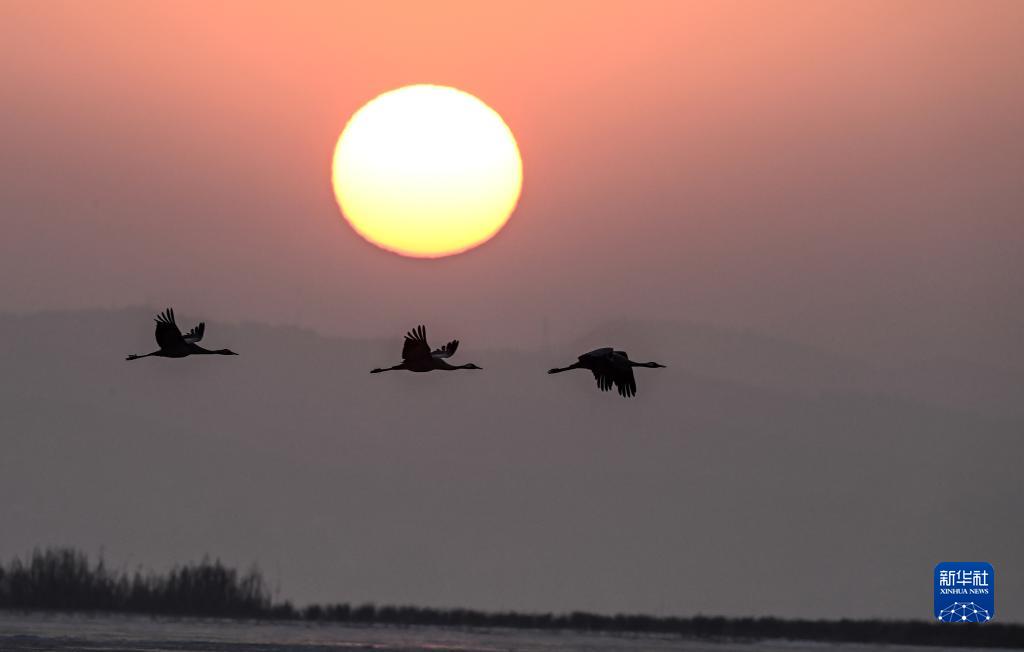在貴州草海國家級自然保護區迎著(zhù)朝陽(yáng)起飛的黑頸鶴(2021年1月13日攝)。新華社記者 楊文斌 攝