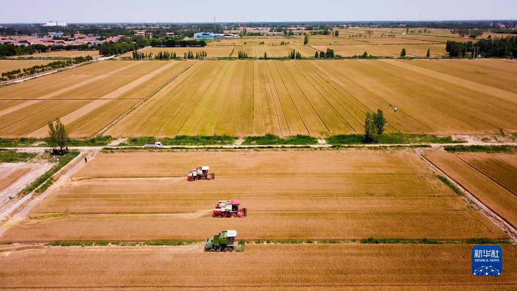 在山東省惠民縣桑落墅鎮,農民駕駛農機收獲小麥(2022年6月7日攝,無(wú)人機照片)。新華社記者 郭緒雷 攝
