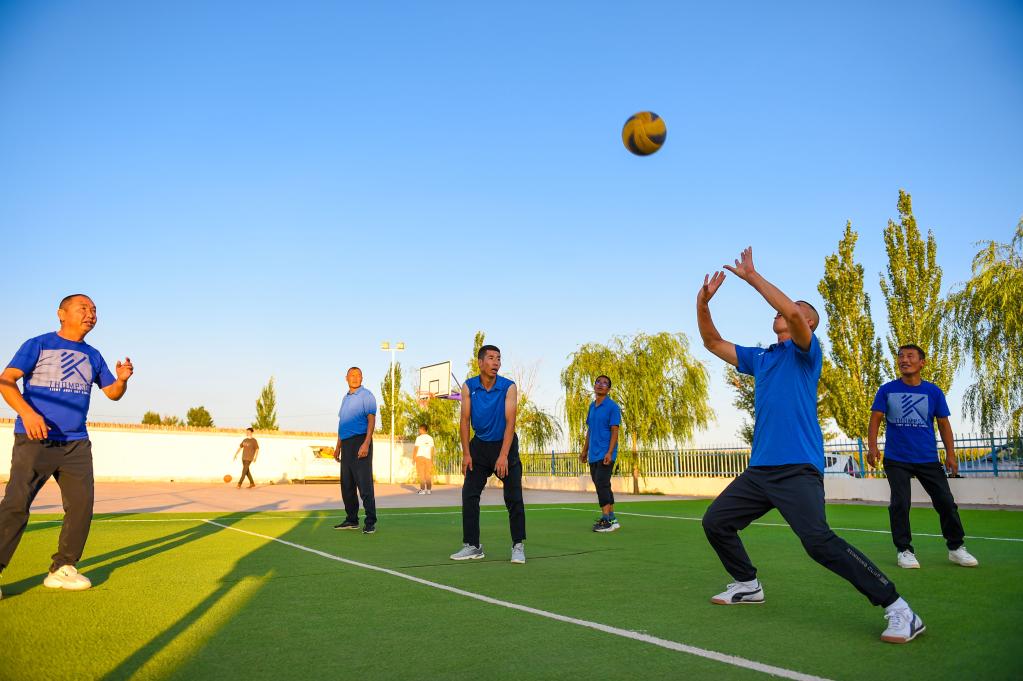 8月30日,農牧民們在內蒙古鄂爾多斯市鄂托克前旗昂素鎮巴彥希里嘎查的排球場(chǎng)上打球