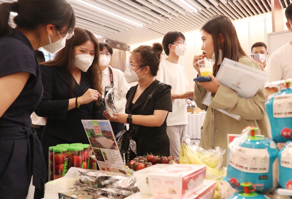 第五屆進(jìn)博會(huì )食品及農產(chǎn)品展區、醫療器械及醫藥保健展區展前供需對接會(huì )在國家會(huì )展中心(上海)舉行。這是對接會(huì )嘉賓在參展企業(yè)展位前品嘗水果(2022年8月30日攝)。新華社記者 方喆 攝