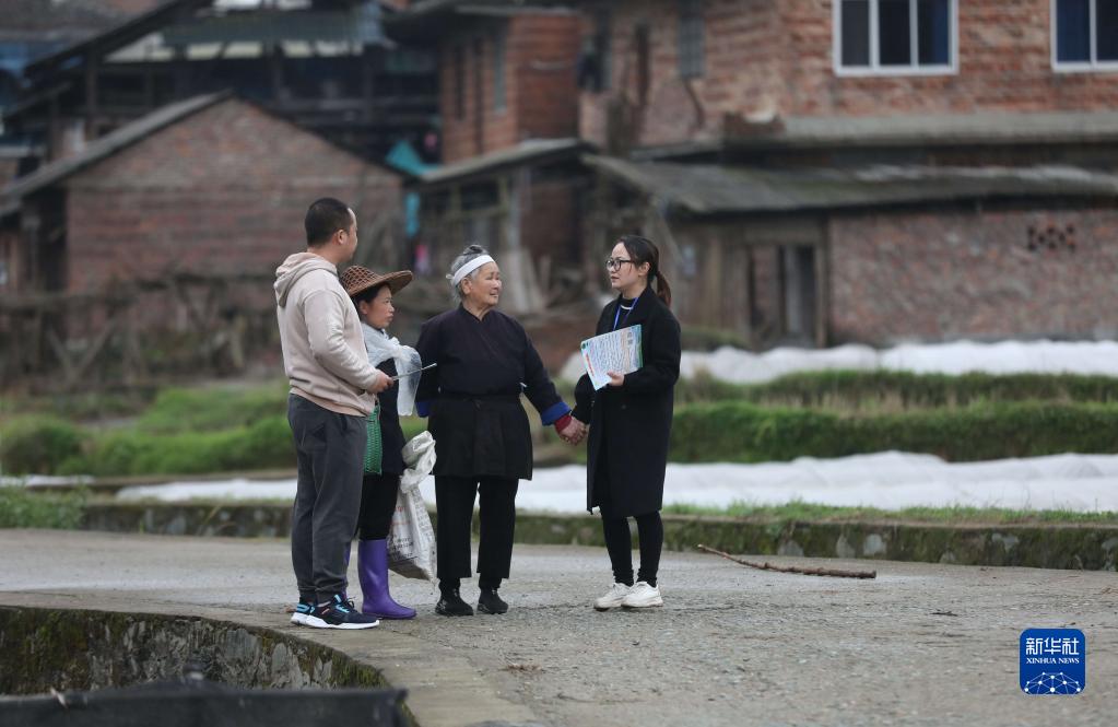 在廣西柳州市三江侗族自治縣良口鄉南寨村,紀檢監察干部(右一、左一)在了解惠農政策落實(shí)情況(2022年3月24日攝)。新華社記者 黃孝邦 攝
