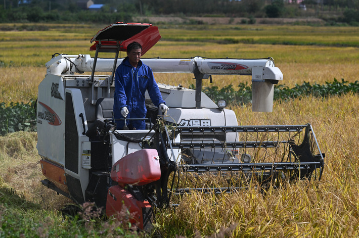 9月29日,安徽省合肥市肥東縣古城鎮農民駕駛收割機收獲水稻。新華社記者 周牧 攝