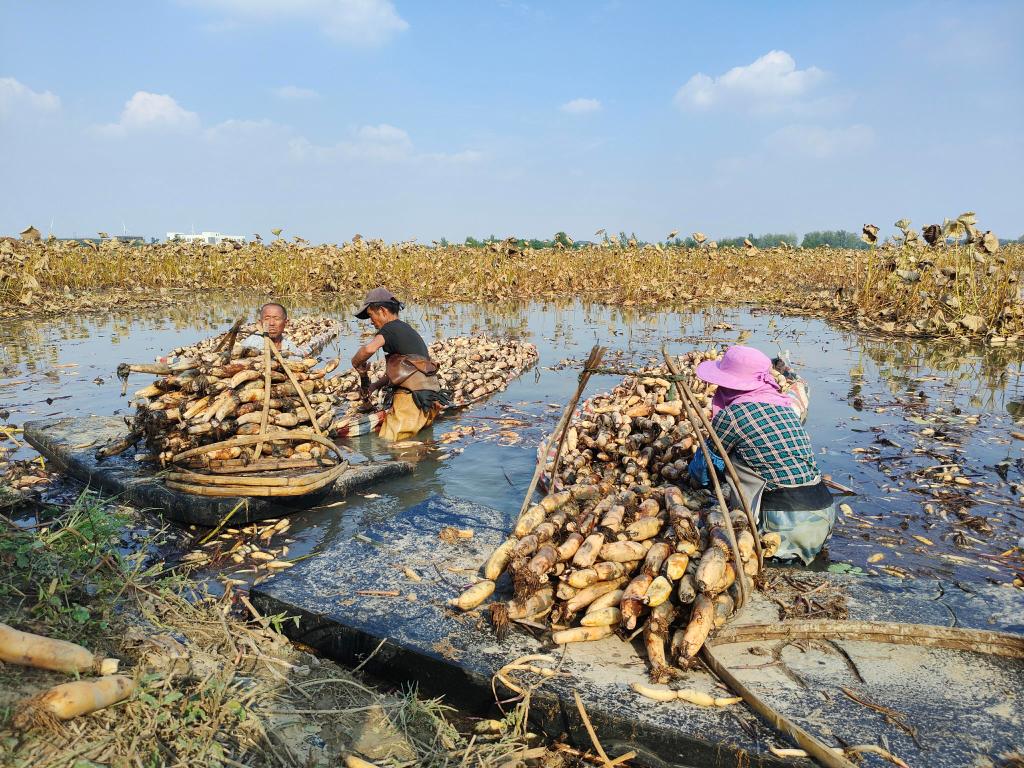 9月28日,在安徽省亳州市蒙城縣岳坊鎮戴堯村,村民們正在搬運蓮藕。新華社記者 姜剛 攝