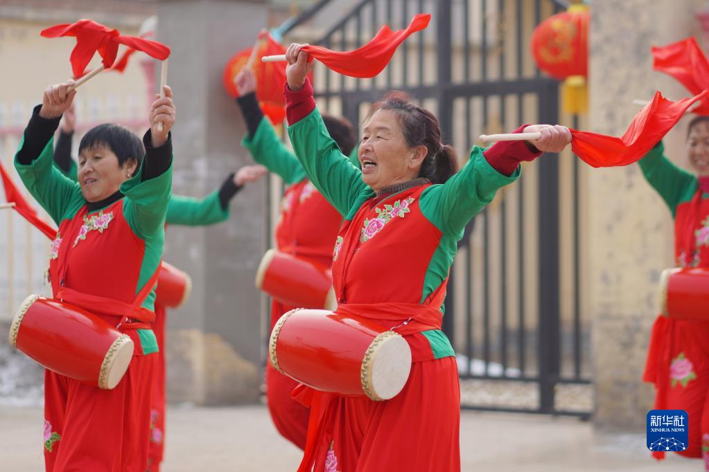 河北省邢臺市內丘縣史村屯村村民在廣場(chǎng)排練腰鼓(2022年1月29日攝)。新華社發(fā)(劉繼東 攝)