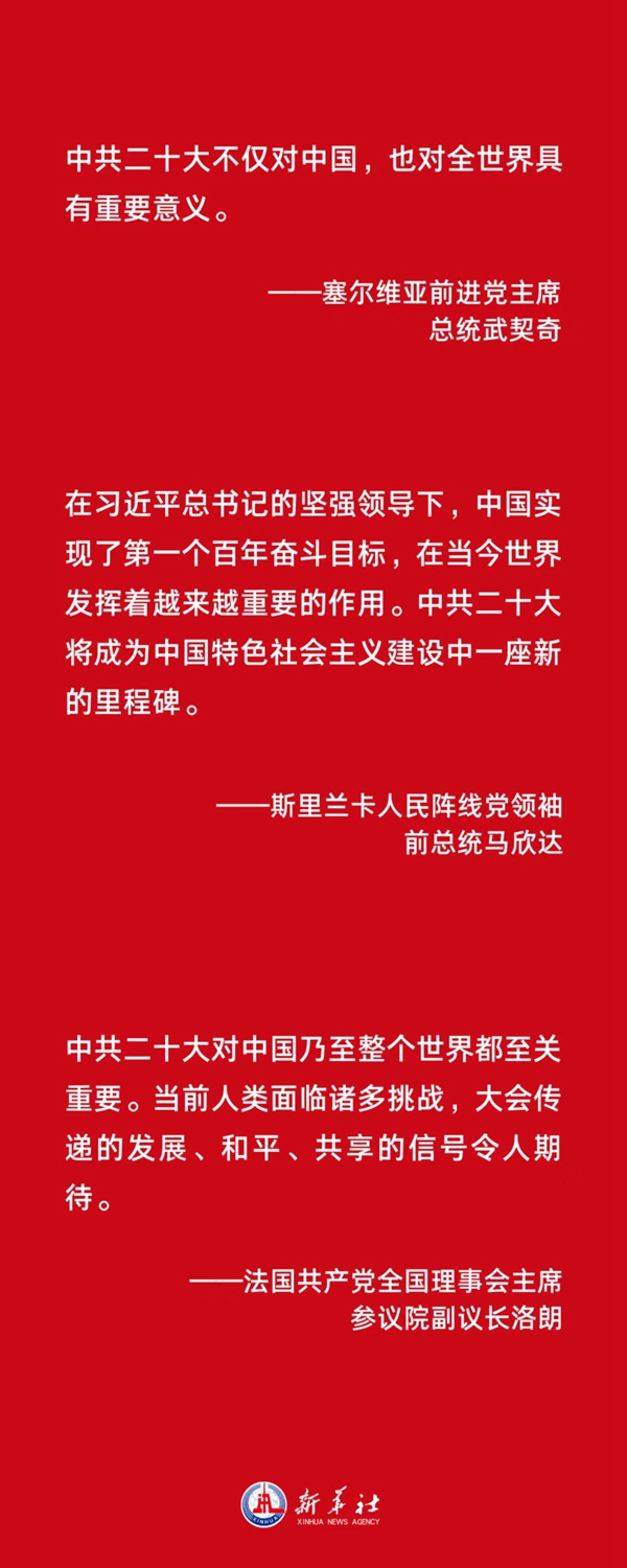 中共二十大回顧總結了過(guò)去五年的工作和新時(shí)代十年的偉大變革,描繪了以中國式現代化全面推進(jìn)中華民族偉大復興的宏偉藍圖。各國政黨政要通過(guò)賀電賀函表達他們對中國的未來(lái)充滿(mǎn)信心,堅信中共必將團結帶領(lǐng)中國人民不斷譜寫(xiě)新時(shí)代中國特色社會(huì )主義新篇章。