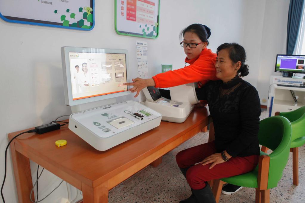 在烏鎮居家養老服務(wù)照料中心,工作人員指導老人使用智能設備測量血壓等指標。(受訪(fǎng)者供圖)