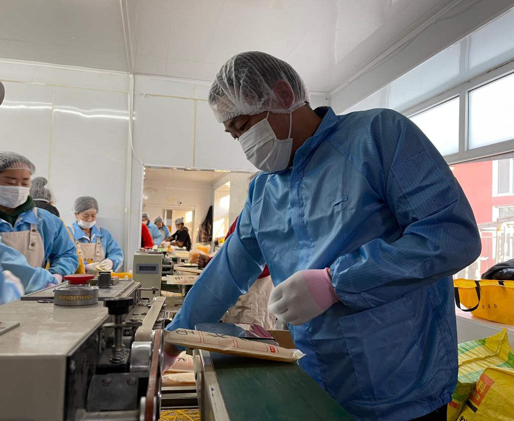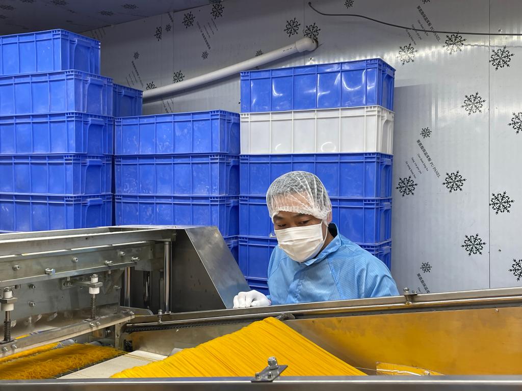 來(lái)到鄉依食品加工廠(chǎng)的生產(chǎn)車(chē)間,工人們正在緊張忙碌著(zhù)。隨著(zhù)機器吐出一袋袋金燦燦的玉米面條,工人們麻利地將面條封裝進(jìn)箱。